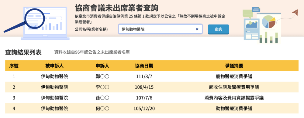 就算是正常程序走動保處調解與消保官調解,伊甸動物醫院就是不出席,而且是無告知就缺席,台北市政府消保官「無故不出席」的黑名單中伊甸動物醫院就是動物醫院中的第一名,正常程序他們也沒在鳥的!