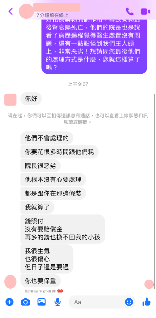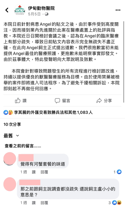 一開始事情發生時,在FB社群爬文找到以前伊甸動物醫院醫糾飼主,對方回應伊甸動物醫院院長是不會理會的,要耗上很多時間,一開始就說院長很惡劣、很會假裝,本來想說我們證據充足,對方應該賴不掉,沒想到還真的就是這樣!